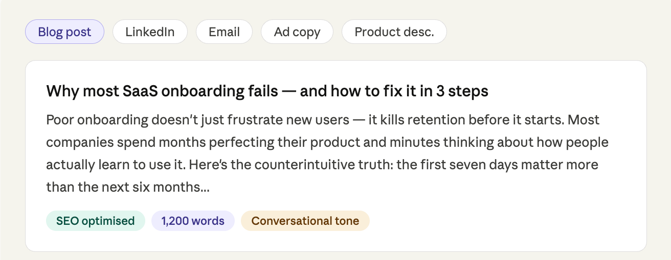 Pick your format, set your tone, and let the AI do the heavy lifting. Edit inline or export straight to your CMS.