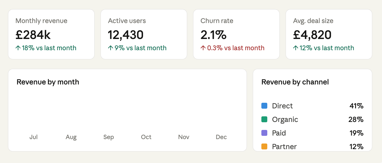Top-line KPIs for leadership — revenue, growth, churn, and runway at a glance.